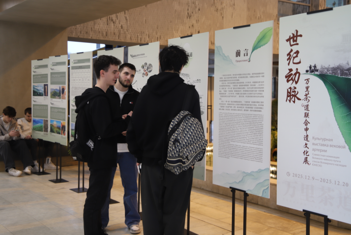 2025 年 12 月 9 日,由湖北省文化和旅游厅暨万里茶道联合申遗办公室主办的“世纪动脉 —— 万里茶道申遗文化展”在俄罗斯人民友谊大学正式开展。此次展览以丰富的图文形式全方位回溯古老商道历史,更特别邀请茶艺师现场演绎传统茶道技艺,搭配定制茶叶伴手礼,为观众带来“可观、可感、可品”的沉浸式文化体验,搭建起中俄两国文化交流与遗产保护的新桥梁。